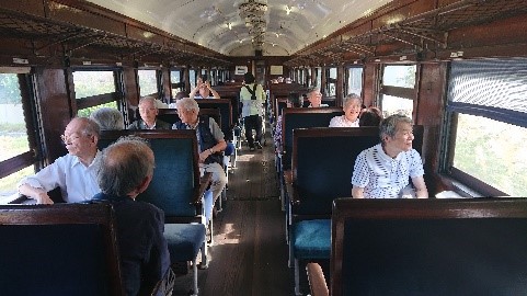 昼食を済ませて新金谷駅に向かい、古いSLや駅舎を展示するロコミュージアムなどを見学してから、蒸気機関車に乗りました。大井川鉄道で一番古い昭和5年製の「C10形8号機」という機関車に引かれましたが、独特なにおいと音、昔懐かしい客席、手動のドアなどに囲まれて、ノスタルジックな時間と空間を体験することができました。
