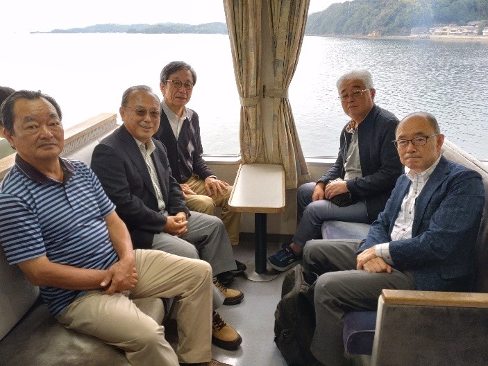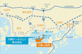 【行程】10:30広島駅発⇒山陽道(40km、40分)⇒11:10小谷SA着(昼食)⇒11:40小谷SA発⇒山陽道河内IC~国道432号(17km、20分)⇒12:00 JR竹原駅着(2名合流)⇒12:10 JR竹原駅発⇒県道185号(2km、5分)⇒12:15竹原港着⇒12:30 竹原港発(フェリー)⇒12:55垂水港着⇒島内観光⇒14:00~16:00大崎クールジェン㈱ 施設概要説明、現場見学