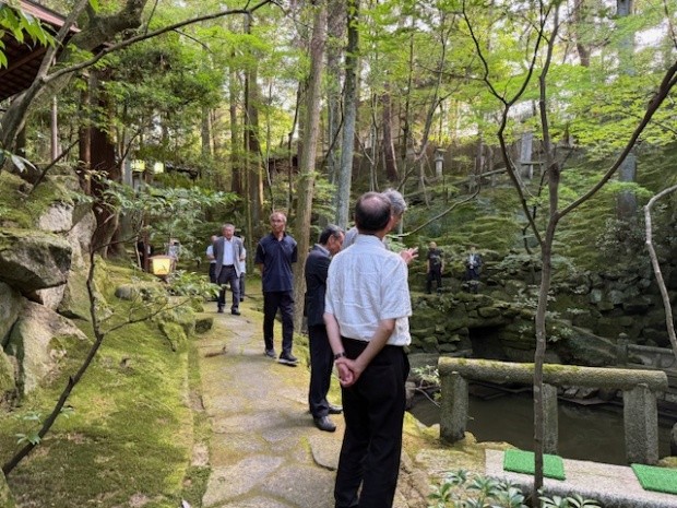 令和7年7月12日、福井市加茂河原の丹巖洞にて北陸支部総会が開催されました。会場はかつて笏谷石の採掘場であり、幕末には志士たちの密会の場ともなった歴史ある草庵です。苔むした庭園や石橋が趣を添える中、29名が参加しました。