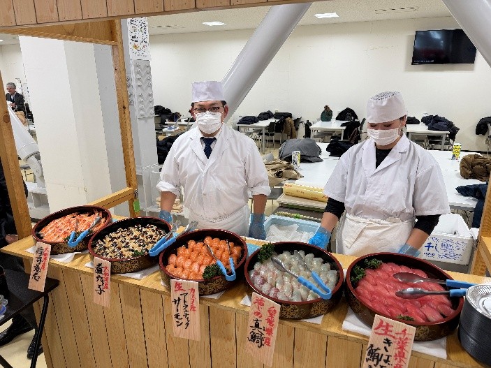 大学生協に手配いただいたステーキと寿司のライブキッチンは今年も好評で、名工大吹奏楽部の皆さんが新年にふさわしい明るい演奏を披露し、会場を大いに盛り上げ