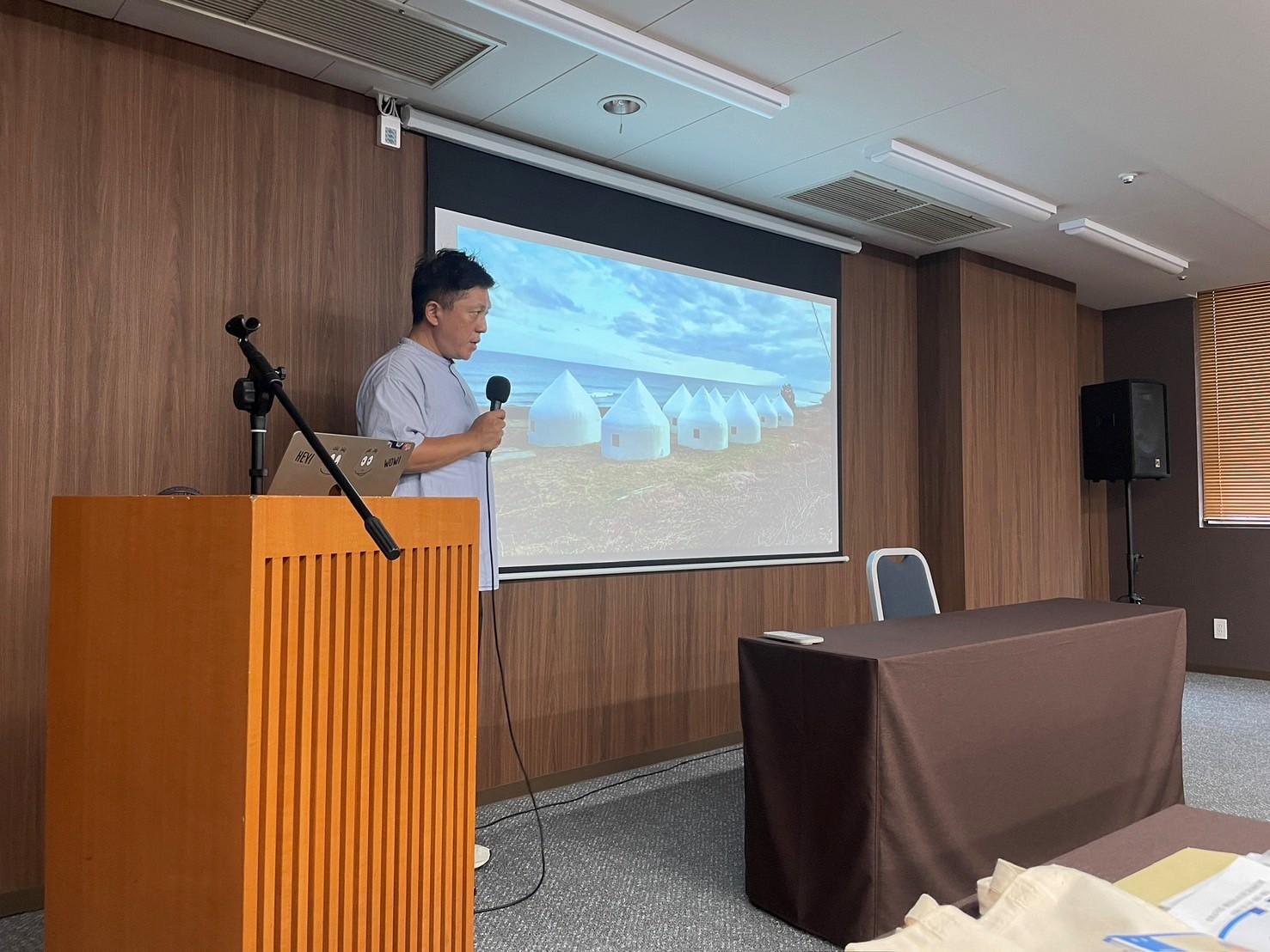 議事終了後の講演会では北川教授にインスタントハウスの成立ちや能登半島地震での活躍についてお話していただきました。盛り沢山の内容でしたがテンポよく講義していただいたので、講演にあてていた1時間があっという間でした。