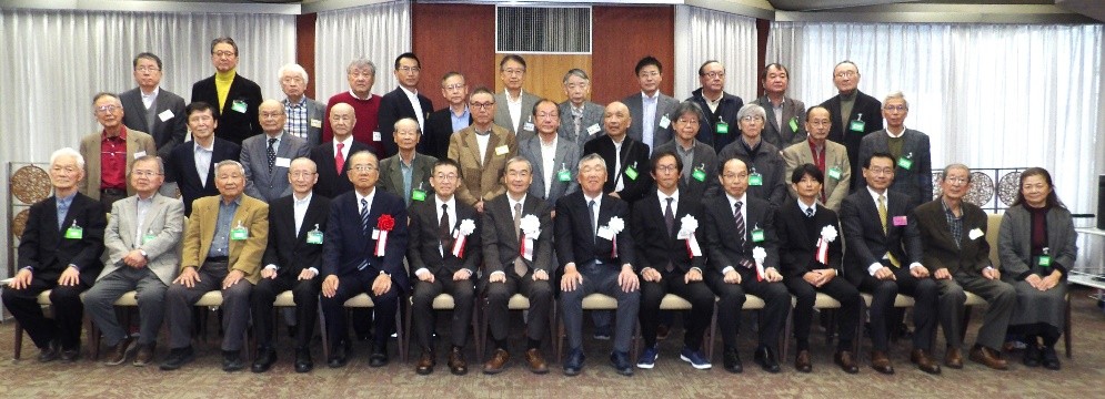 ご来賓を囲んで出席者全員の写真撮影を2回に分けて行ったあと、戸澤副支部長(M55)による乾杯の発声で懇親会を開始しました。名工大関係のビデオがプロジェクターで映し出されるなか、ご来賓を交えた懇親会は、大変賑やかなまた和やかなものとなりました。席上、滝義宏さん(D39)による恒例のハーモニカの演奏も披露されました。また出席者の若手の中から平成29年卒業の電影会 伊原滉也さんに、明るく元気にご挨拶いただきました。最後はハーモニカの伴奏で学歌を斉唱し、大久保副支部長(D57)の音頭で三本締めを行い、来年の再会を約してお開きとしました。